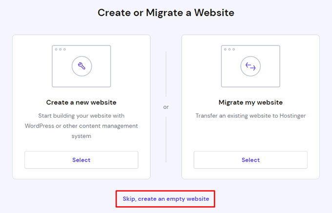 Then, you will be prompted to create a new website or migrate an existing website, simply click on Skip, create an empty website button.